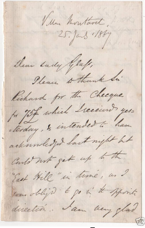 Please to thank Sir Richard for the Cheque for 75£ which I received yesterday, & intended to have acknowledged last night but could not get up to the “East Hill” in time, as I was obliged to go in the opposite direction. I am very glad you like the Drawings: the Framer has now sent me his account, & you will owe me 62 francs de plus ― for glasses & frames.