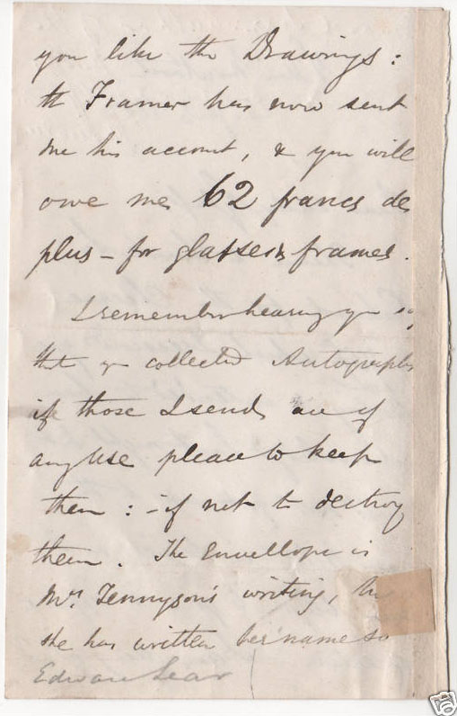 I remember hearing you say that you collected Autographs, if those I send are of any use please to keep them: ― if not to destroy them. The envellope [sic] is Mrs. Tennyson’s writing, and she has written her name so [page(s) missing]