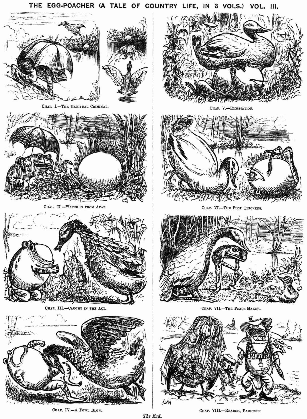 George du Maurier “took, in 1869-1870, a brief Darwinian respite from his usual labors of satirizing the Victorian drawing room” and, among other things, produced an “unusually extensive and charmingly anthropomorphic picture-story” (Kunzle 293), which appeared in three fortnightly instalments in Punch: April 10, April 24 and May 8, 1869 (vol. 56, pp. 146, 174 and 194).
