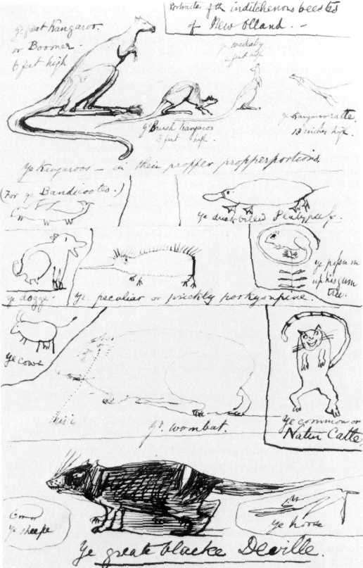But the most important development in the establishment of the wombat’s English reputation was the appearance in 1855 of John Gould’s de luxe The Mammals of Australia. Gould was in Australia much earlier, in the 1830s, and it was certainly through Gould that the artist Edward Lear, who illustrated Gould’s Birds but unfortunately not the Mammals, made a wonderful sheet of whimsical drawings of the ‘Inditchenous Beestes of New Olland’, a rarity which is today in the collection of the Pierpont Morgan Library in New York. These are plausibly accurate caricatures of various species of kangaroo and wallaby, the platypus, the ‘possum up his gum tree’ and the Tasmanian Devil. There are also mad renderings of the bandicoot, echidna and native cat, not to mention representative appearances in the margin of the cow, the dog, the sheep and the horse. Splendidly rotund and occupying the largest amount of space towards the bottom centre of the sheet is the wombat, with his ‘i’.