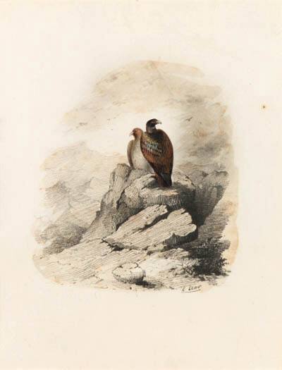 Between 1827 and 1830 Lear was introduced to the natural history illustrator Prideaux Selby by an aquaintance Mrs Wentworth and it is thought that he served an unofficial apprenticeship with the artist. Lear executed 17 drawings as a gift to Mrs Wentworth. These vignettes executed in pencil with the birds coloured in watercolour were generally of unidentifiable, imagined birds. The present drawing is a very similar work and is likely to have been executed about the same time. For an example of such drawings and a discussion of Lear’s early work see V. Noakes, The Painter Edward Lear, Newton Abbot, 1991, p. 33.