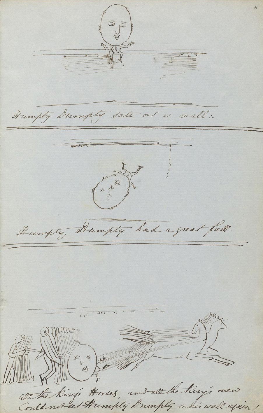 Houghton Library, Harvard University, has started digitizing some of the many Edward Lear manuscripts in their collections. Two weeks ago, the never-before-published Mrs. C. Beadon Edward Lear scrapbook, 1852-1880. MS Typ 55.23 went online. Beside a number of sketches, this contains three sets of drawings for norsery rhymes, two versions of “Sing a Song of Sixpence,” and Lear’s adaptation of “Humpty Dumpty.”