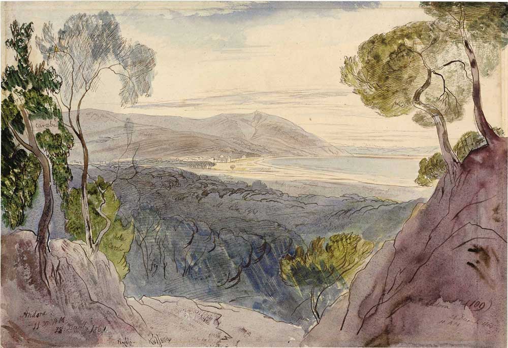Lear’s technique would be to make a quick pencil sketch with color notations. Back in his studio – or even in his tent later that evening if he was on a long walking trip – he would have ‘penned out’ the composition. That is, he would go over his pencil lines and even his color notations in pen and ink, and fill in the composition with watercolor following his notes. These ‘penned out’ drawings were not meant to be exhibited or sold, but were rather the basis for watercolors commissioned by Lear’s patrons who would visit his studio and choose from among a group of them. Indeed, it was not until 1929, when two large collections belonging to the descendants of Lord Northbrook and Franklin Lushington came up for sale, that this aspect of Lear’s oeuvre became known to the general public.