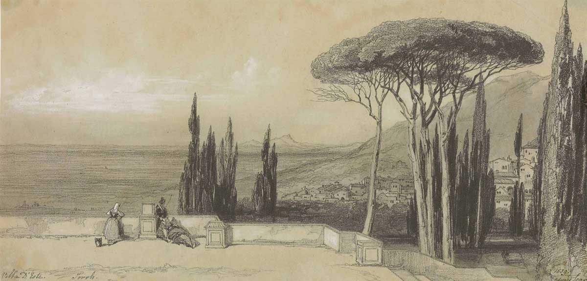 Inscribed ‘Villa D’Este. Tivoli’ (lower left) and signed and dated ‘1839./Edward Lear’ (lower right).