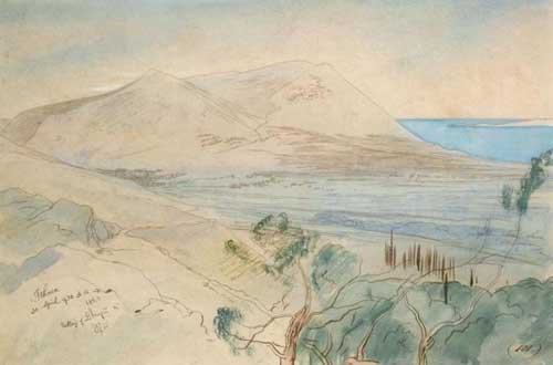 In 1863, the date of the present work, Lear was 51 years old. Between 1862 and early 1864 he had largely divided his time between Corfu and England. However, from April to May he conducted a brief tour of the other Ionian islands. Ithaca lies to the north-east of Kefalonia and Lear described it as ‘Ulysses’ Kingdom’. He was clearly inspired by the island for in letter to Ann, his wife, he wrote: ‘[Ithaca] is a little island and charmingly quiet. I delight in it,’ (see Angus Davidson, Edward Lear, 1968, p.50).