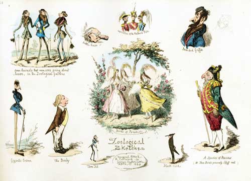 Lear was the first to use the idea for purely nonsensical purposes, but George Cruikshank had already produced several satiric images in which humans assume animal characteristics, most notably perhaps in Plate I of My Sketch Book, no, IV (1834):
