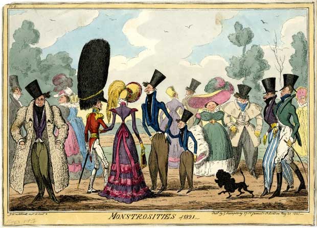 This plate, in turn, was a development of an older series which had kept Cruikshank engaged for several years, “Monstrosities of … .” Here is the plate for 1821, for instance: