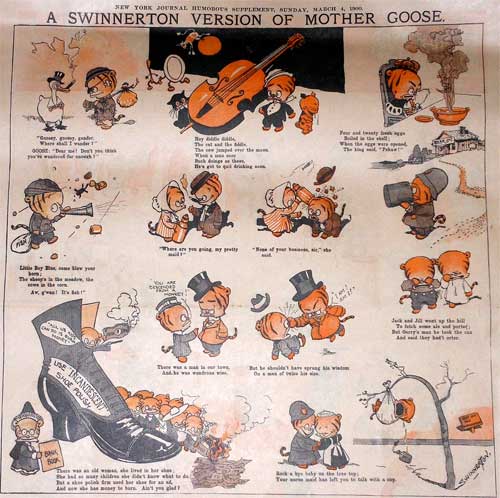 The early comics supplements in American newspapers often used traditional nonsense and nursery rhymes to fill their pages. Here is an example of an updated version of Mother Goose rhymes by one of the pioneers of comics, Jimmy Swinnerton; it is from the New York Journal of 1 March 1900.
