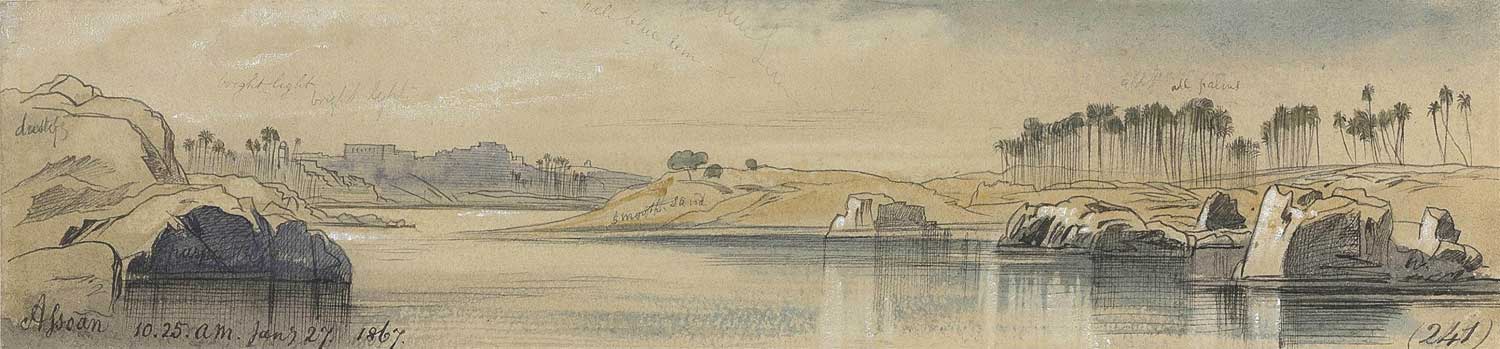 At the beginning of 1867 Lear travelled south from Cairo, picking up his Canadian cousin Archie Jones at Luxor. They reached the second cataract, the most southerly point of their journey, on 4 February. At Aswan, where Lear executed the present drawing at 10.25 on the morning of 27 January, he also executed a larger panoramic drawing of the river, which he numbered ‘245’. That was done at 5.30 pm. At 11.30 am, immediately after executing the present drawing, he turned his attention away from the river and drew the Aswan quarries. The quarry drawing, which is rectangular in format, is numbered ‘242’.