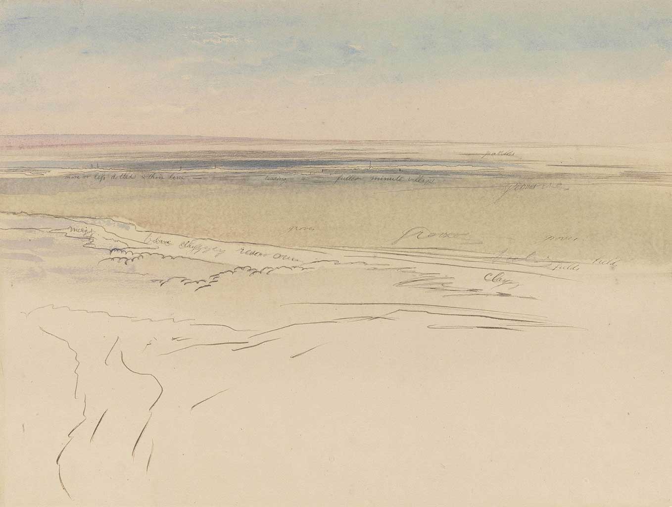 Edward Lear travelled in Palestine, then Lebanon and Syria for three months in the spring of 1858. The sculptor Thomas Woolner (1825-1892) considered his Holy Land drawings ‘the most beautiful things he has ever done not only for the mystery and history attached to the places themselves but also for the excessive fineness, tenderness and beauty of the art displayed in them’ (letter of 22 October 1858, quoted in V. Noakes, Edward Lear 1812-1888, 1985, p. 112). Towards the end of May 1858 he was at Damascus, executing drawings for a panoramic oil that was painted in England in 1860-61.
