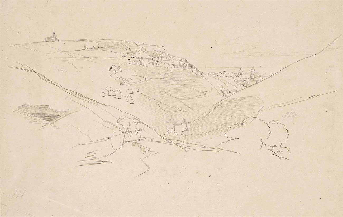 Inscribed and dated ‘Modica/8 June 1867’ (centre right) and with colour notes throughout. Pencil and pen and brown ink. 12 x 18 in. (30.4 x 45.7 cm.)