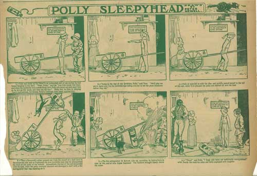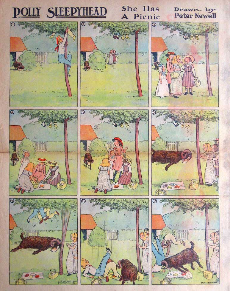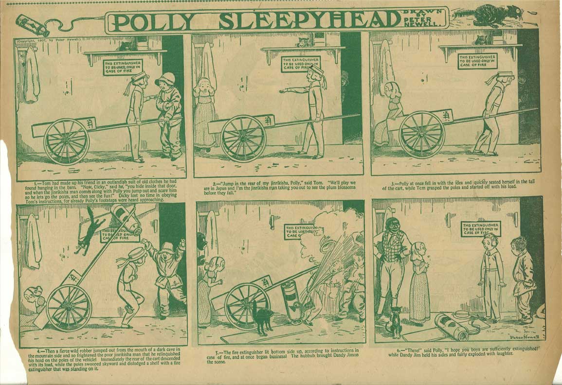 In the last episodes of Peter Newell’s The Naps of Polly Sleepyhead the naps disappear, not only from the title: she is now the intended victim of Tom and Dicky’s practical jokes, but she regularly manages to inadvertedly turn the tables on them.