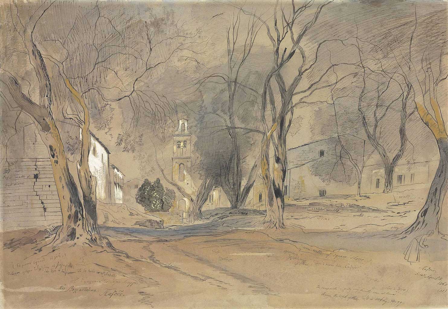 Dated and numbered ‘5.45 April 8./1863/(21)’ (lower right) and inscribed ‘The campanile is only very faintly seen at times,/through the veil of olives. It is ochkry [sic] w_ gy.’ (lower right) and extensively inscribed in Greek and with color notes (lower left). Pencil, pen and ink and watercolor heightened with touches of bodycolor, on buff paper. 14¾ x 21½ in. (37.5 x 54.6 cm.)