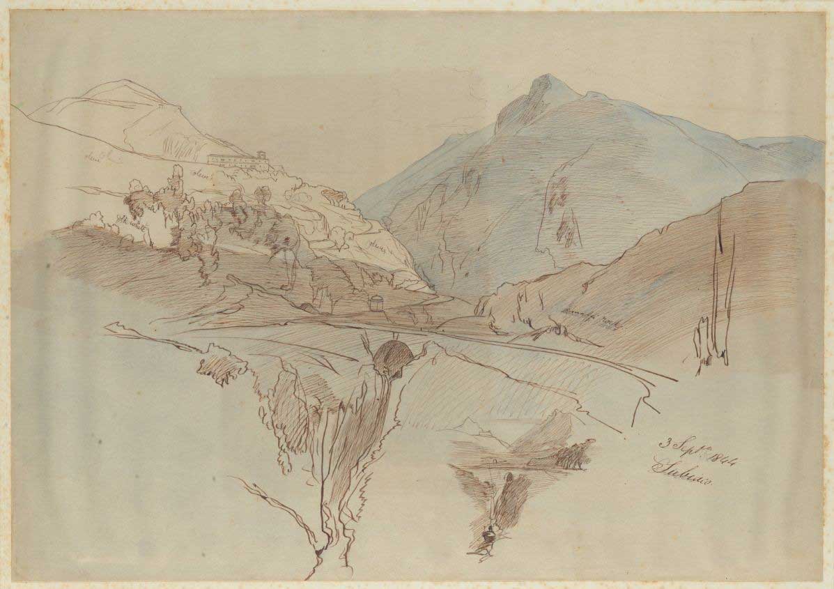 I’ve just checked my list of (some of) his drawings by year and journey. He was active in October 1844 – I’ve a record from Houghton of a drawing at Leonessa 3 October, but then the next dated drawings I have found (again at Houghton) are in March 1845 when he did a whole series in the Alban Hills, commencing with Cicero’s Villa on 3 March. He then did a fresh series in the Volscian mountains from end of March to early April. Could either of these be linked to Virgil?
