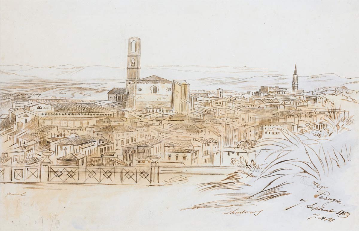 Lear drew this large pen and ink study during a visit to Perugia in September 1883. A late work, he skilfully depicts the ancient city with its patchwork of small streets and tiled roofs. Towering above the other buildings is the Basilica San Domenico, while in the distance the Umbrian hills can clearly be seen.