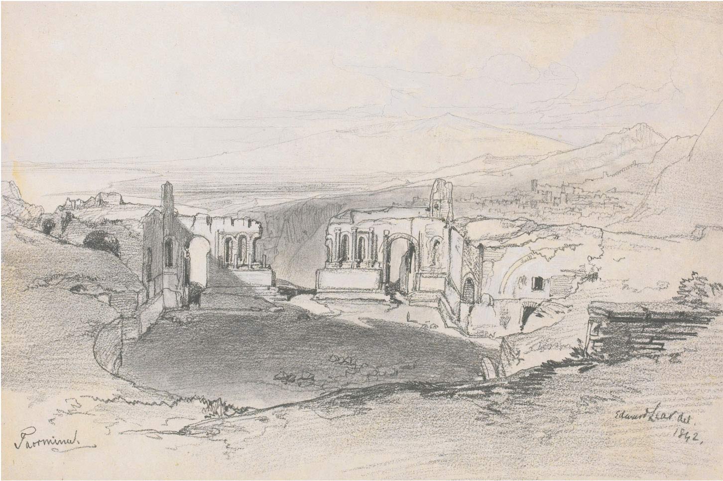 Pencil and grey wash, heightened with white, on grey paper; inscribed lower left: Taormina; signed lower right: Edward Lear del.1842. 165 by 250 mm.