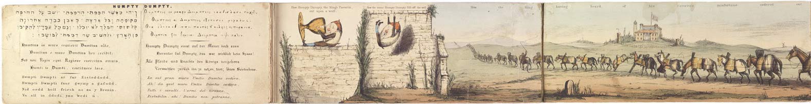The Pictorial Humpty Dumpty consists of seven hand-colored engraved panels (3 1/2 x 9 1/2 in; 88 x 240 mm) in accordion format within cloth-backed, hand-colored boards opening to a total of sixty-three inches. Verses in English, Welsh, French, Hebrew, German, Latin, Italian, and Greek. This is the second issue, with the rhyme translated in six languages (the first, according to this page, lacked Italian and Welsh and was not coloured). Below are the best images of the whole I was able to find:
