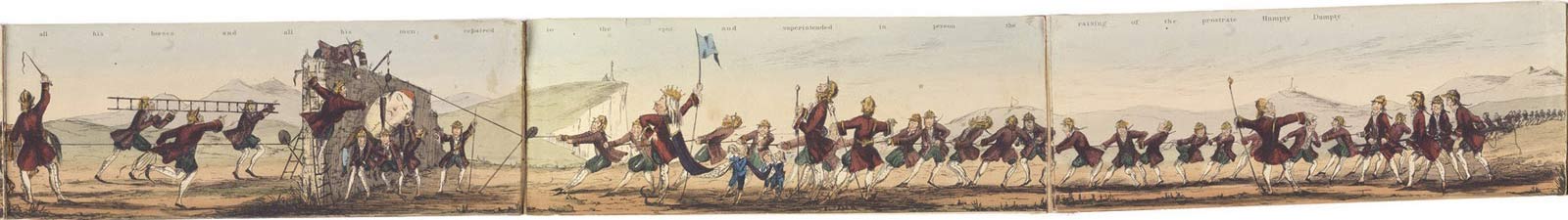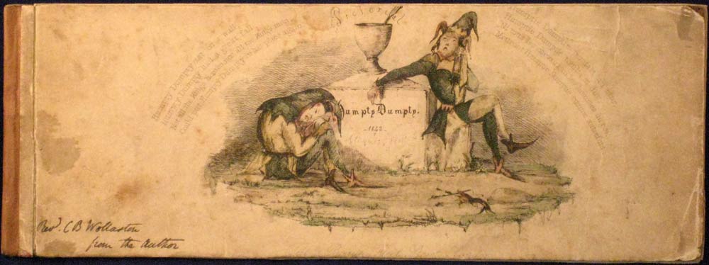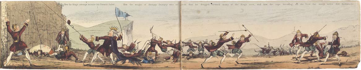 Last year I posted Edward Lear’s version of Humpty Dumpty, and was reminded of Aliquis’s Pictorial Humpty Dumpty (London: Tilt & Bogue, 1843), another “panorama” by the author of The Flight of the Old Woman Who Was Tossed Up in a Basket (London: D. Bogue, 1844; see it on nonsenselit.org, or buy it from Optical Toys).