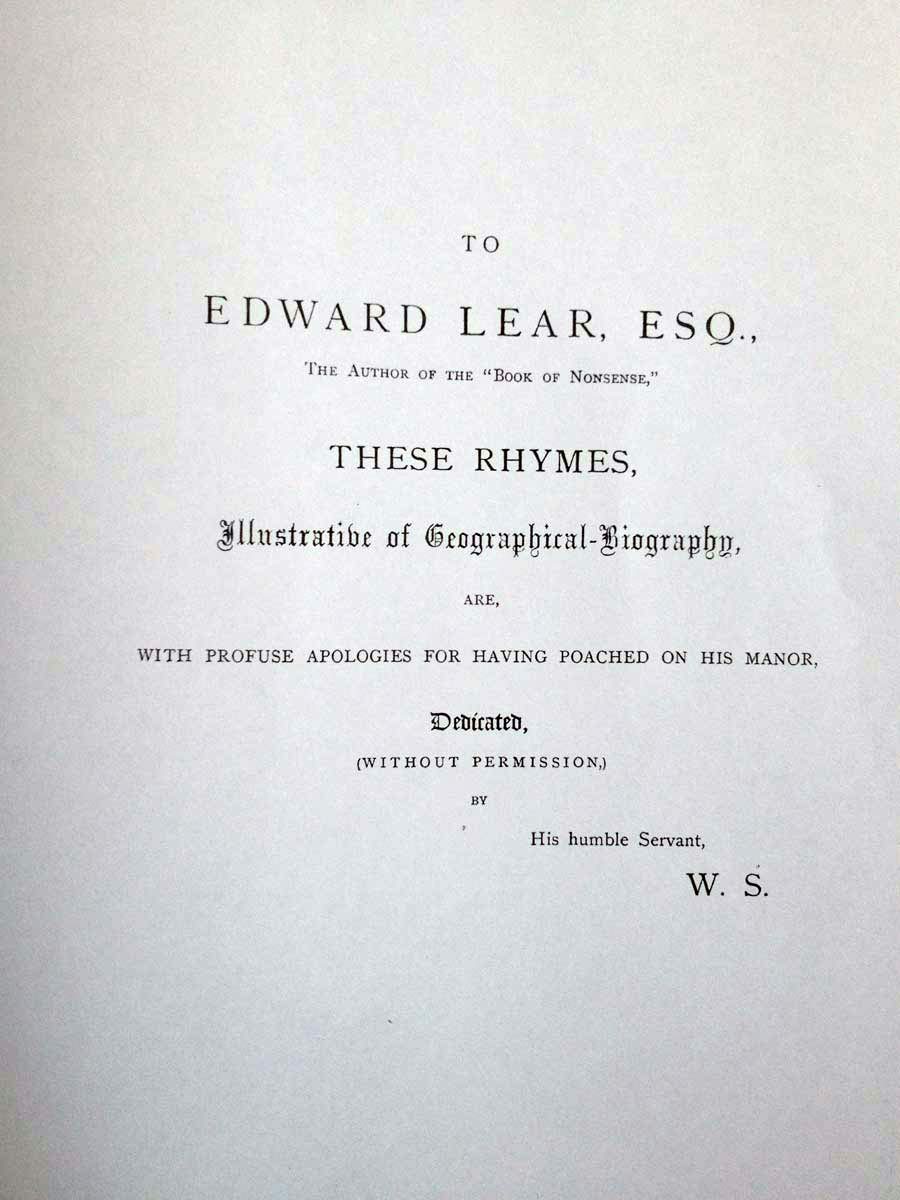 Bob Turvey, who owns a large collection of limerick books, kindly sent me three images — the title page, the dedication to Edward Lear and the rhyme Lear mentions in the letter — which fully confirm this is the volume W.S. sent Lear. Here are the pictures: