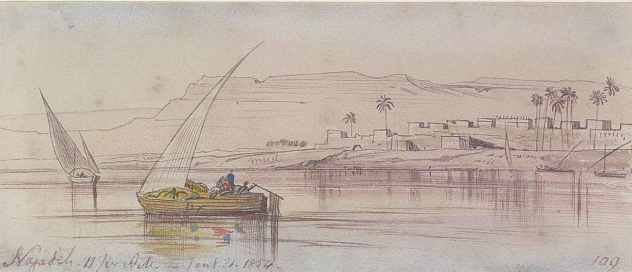 Inscribed and dated ‘Nayadeh 11½ am Jan .. 21. 1854’ (lower left) and numbered ‘109’ (lower right) and inscribed ‘Uppermost’ and numbered ’23’ (verso of the sheet). Pencil and watercolour heightened with bodycolour. 2? x 6? in.; and A scene on the Nile.