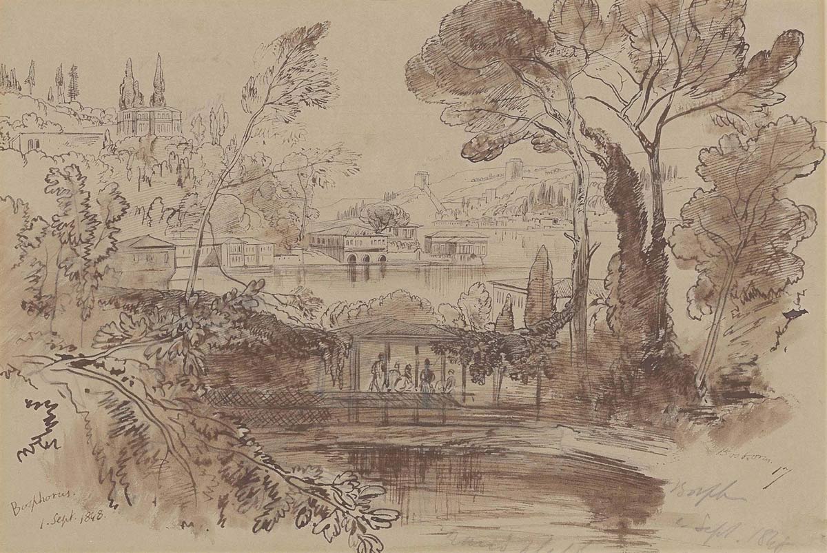 Inscribed and dated ‘Bosphorus./1. Sept. 1848′ (lower left) and again in pencil (lower right) and numbered ’17’ (lower right) and further inscribed with colour notes. Pencil, pen and brown ink and brown wash on paper. 10 ¾ x 14 in. (27.4 x 35.4 cm.)