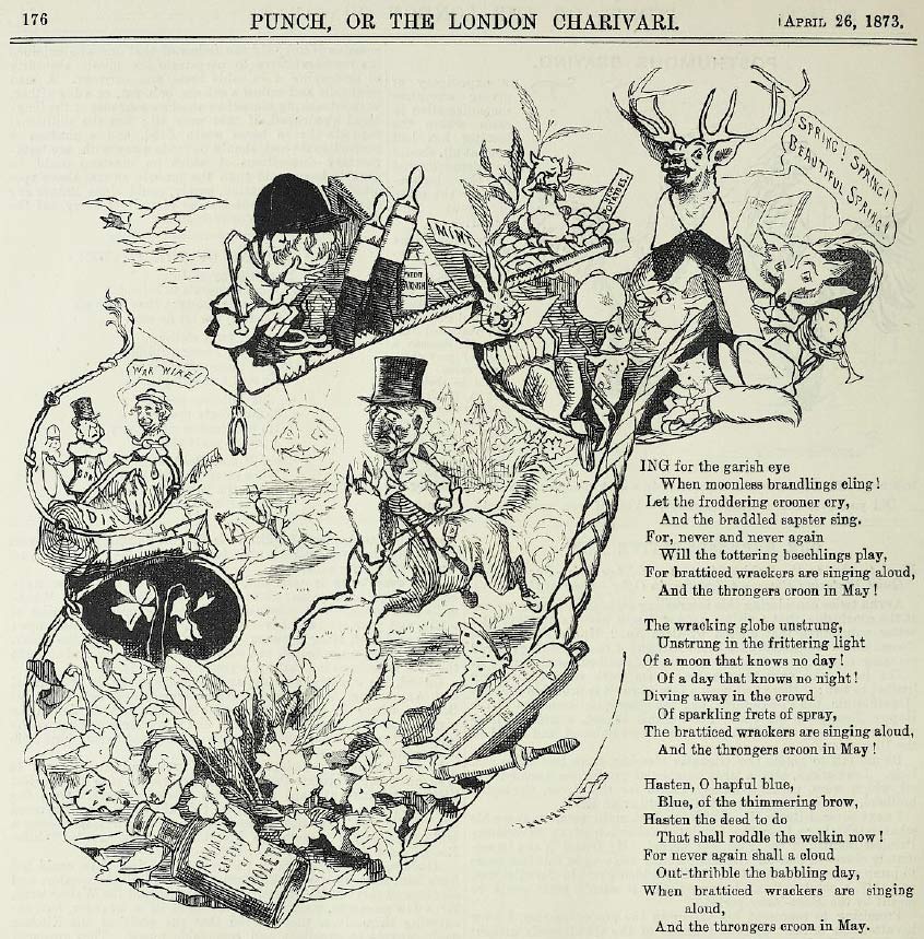 “The Advent of Spring” is a parody of Tennyson’s notorious haziness of meaning, with particular reference perhaps to the poet laureate’s “The Progress of Spring” or “Early Spring.” The poem, with its profusion of invented words, sounds a lot like Lewis Carroll’s “Jabberwocky,” which would only appear ten years after the first Fun publication.