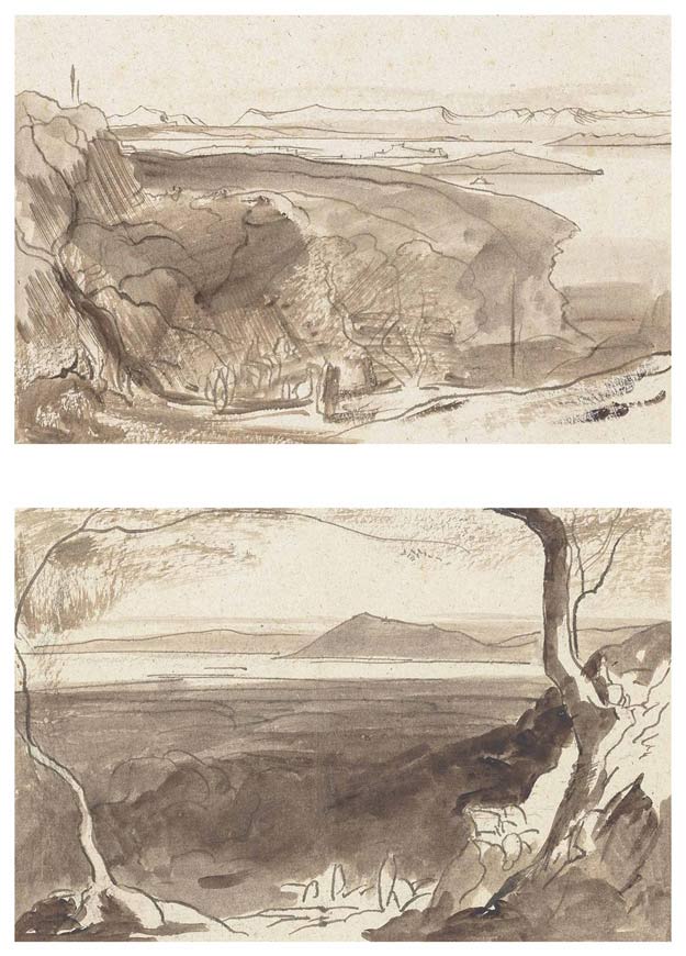 The first inscribed ‘Santa Maura’ (lower centre, in the margin), the second inscribed ‘Corfu’ (on a fragment attached to the mount). Pencil, one pen and brown ink, both brown wash, on oatmeal paper. 9¼ x 14½ in. (23.5 x 36.8 cm.).