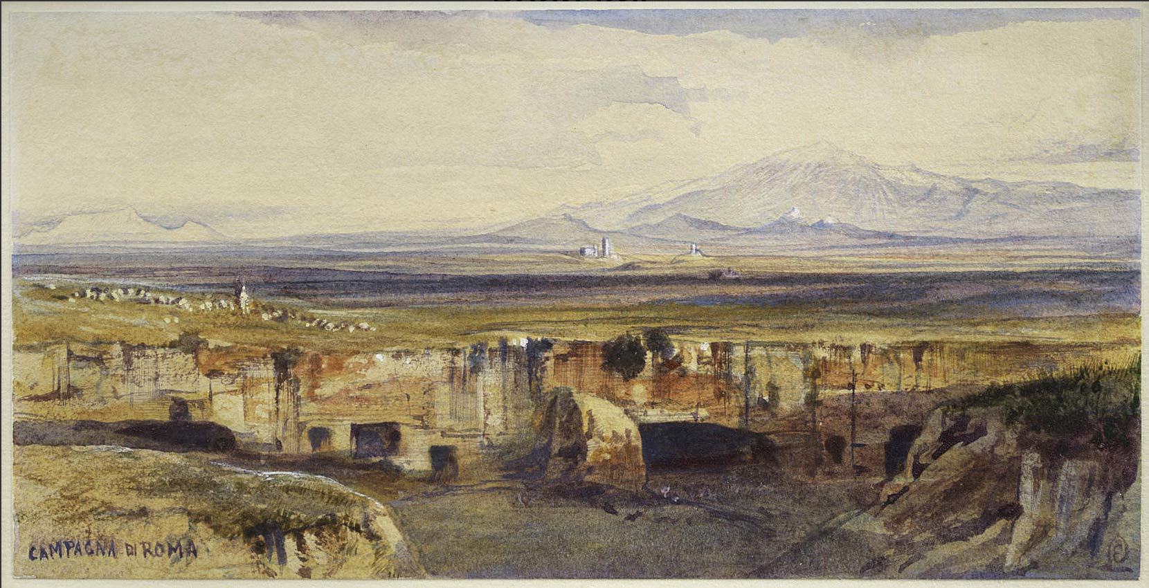 Signed with monogram (lower right) and inscribed ‘CAMPAGNA DI ROMA’ (lower left). Pencil and watercolour, heightened with white and gum arabic. 10.1 x 20.3cm (4 x 8in).