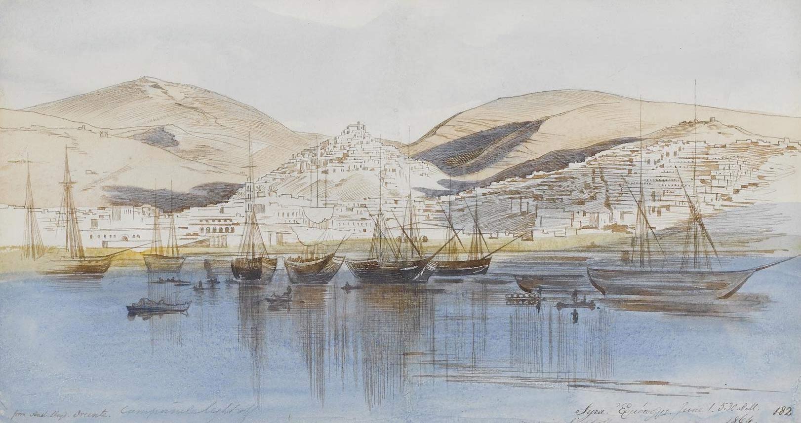 Lear visited Syra on his way back to Athens at the end of a two month exploration of Crete during which he made nearly two hundred drawings. He had sailed from Khanià early in the morning of 31 May, and sat on deck as the boat sailed north through the Cyclades. “The multitude of ‘Isles of Greece’ is quite uncommon and lovely”, he wrote in his diary, “About eight we reached Syra. A wonderful voyage!”.