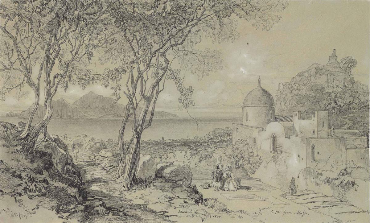 Signed, inscribed and dated ‘Edward Lear del. 1840/Capri from Massa’ (lower right)
