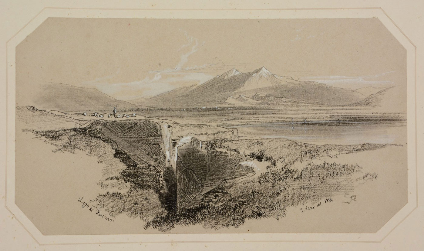 Black chalk, pencil, touches of wash, heightened with white, on light grey coloured laid paper. Signed and dated 1844 lower right, inscribed Lago di Fucino lower left. 14 x 26 cm. (5 1/2 x 10 1/4 in), corners trimmed.