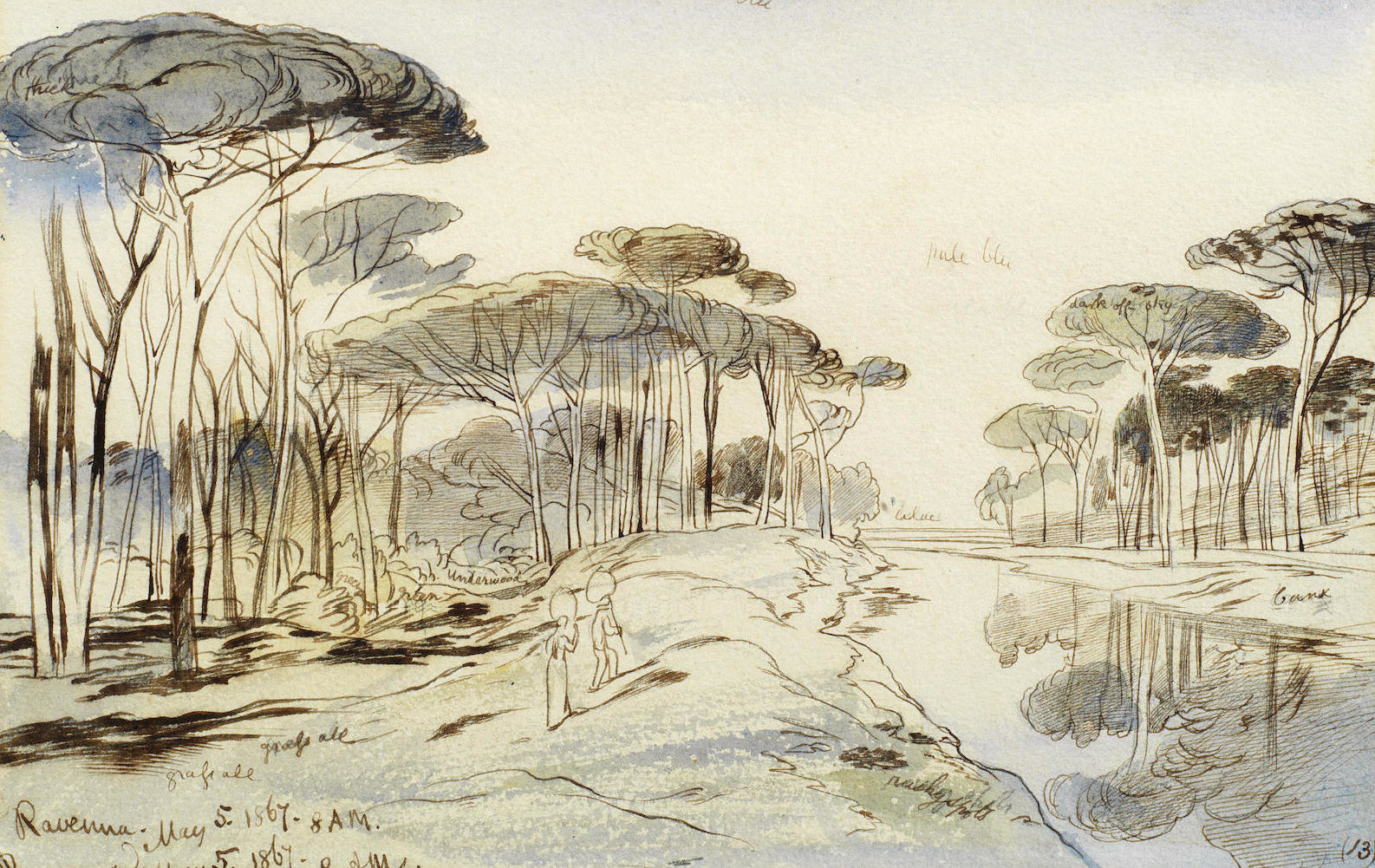Inscribed and dated ‘Ravenna.May 5.1867.8AM.’ (lower left), numbered ‘(13)’ (lower right) and inscribed with various colour notes. Pen and watercolour. 15.4 x 25cm (6 1/16 x 9 13/16in).