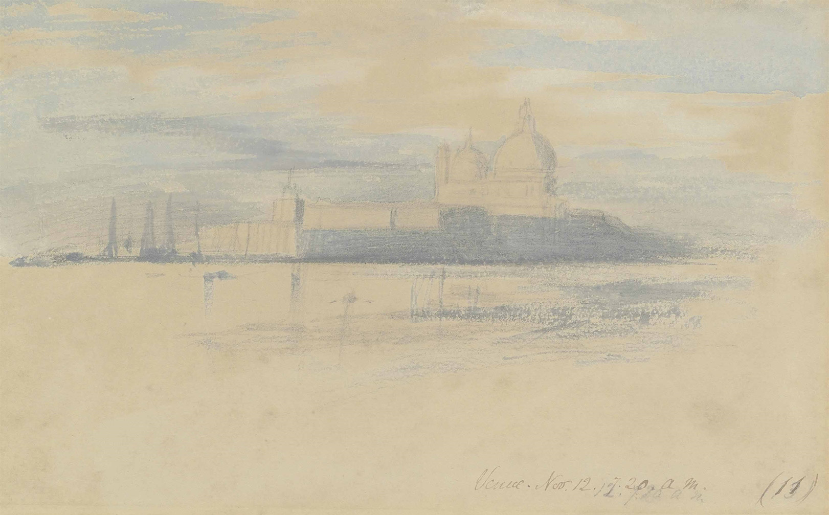 Inscribed ‘Venice. Nov. 12. [1865?] 7.20.am. (11)’ (lower right). Pencil and watercolour on paper. 6 1/8 x 10 in. (15.5 x 25.4 cm.)