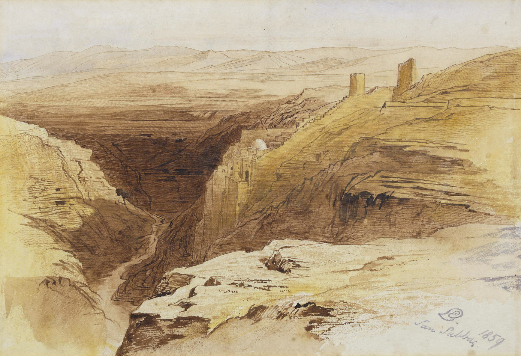 Signed with initials, inscribed and dated ‘San Sabbas/1859’ (lower right). Pen, ink and sepia wash. 20.5 x 30.5cm (8 x 12in).