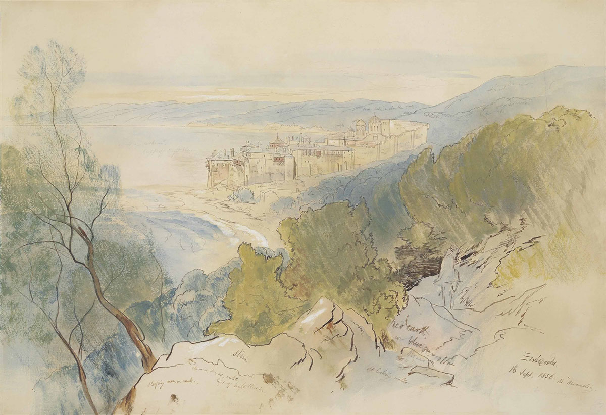 Inscribed ‘Xenophonta’ (in Greek) and inscribed and dated ’16 Sept. 1856. 14.’ ‘Monastery.’ (lower right), further inscribed with colour notes and numbered ’83’ (lower right).