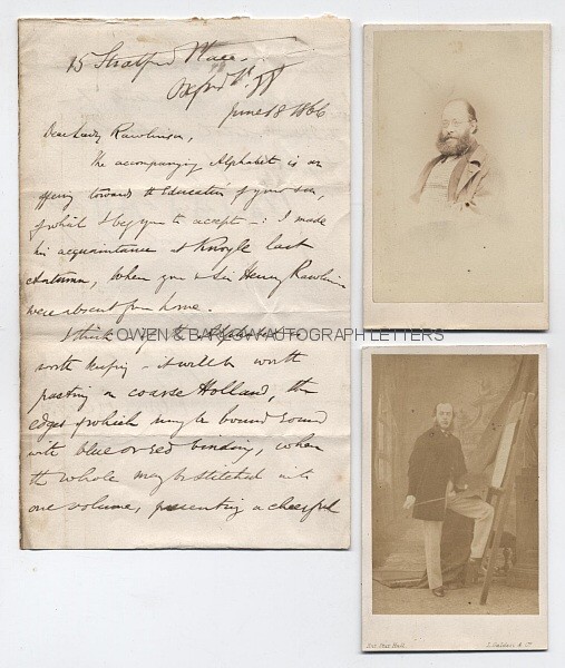 ALS. 2pp. 15 Stratford Place, Oxford Street, W. June 18th 1866. To “Dear Lady Rawlinson”. Together with two contemporary carte de visite portrait photographs of Edward Lear and a pencil sketch possibly by his hand.