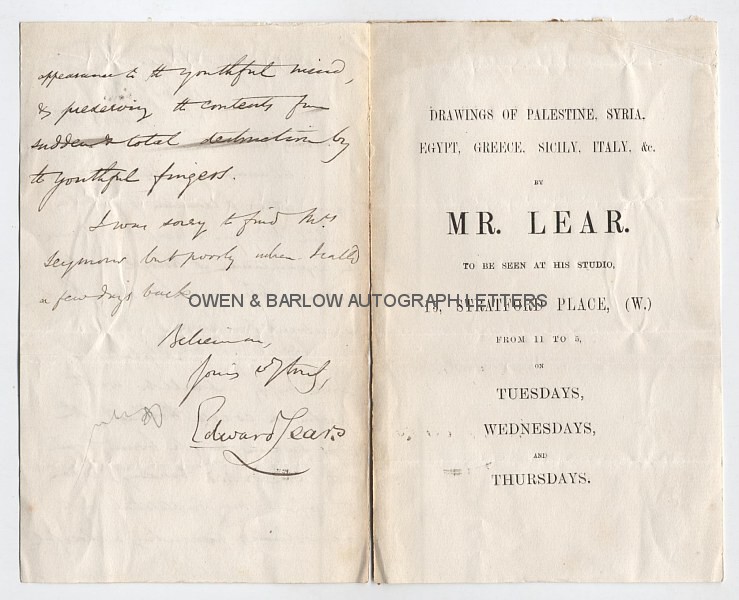 The letter is integral to a printed sheet with an announcement of an exhibition of Lear’s Views in Palestine, Syria, Egypt, Greece, Sicily, Italy, etc, at his studios.