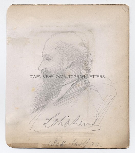 Together with two carte de visite photographs of Edward Lear (one by L. Caldesi & Co showing him painting in his studio and the other a vignette portrait by McLean Melhuish & Haes). Together with a pencil sketch from the same album leaf on which these items were mounted showing a bearded, balding gentleman (who resembles Lear himself) with an undeciphered name or signature below and dated 1865 Jany 30. The sketch is possibly by Edward Lear or of him. The letter is torn along fold between the two leaves and with some creasing and mounting traces on verso of the printed leaf. Both photographs are fine. The drawing has some browning to bottom edge, offsetting from a mounting on an opposite page of the album and mounting traces on the verso.