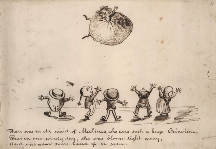 There was an old maid of Malines, who wore such a huge Crinoline,