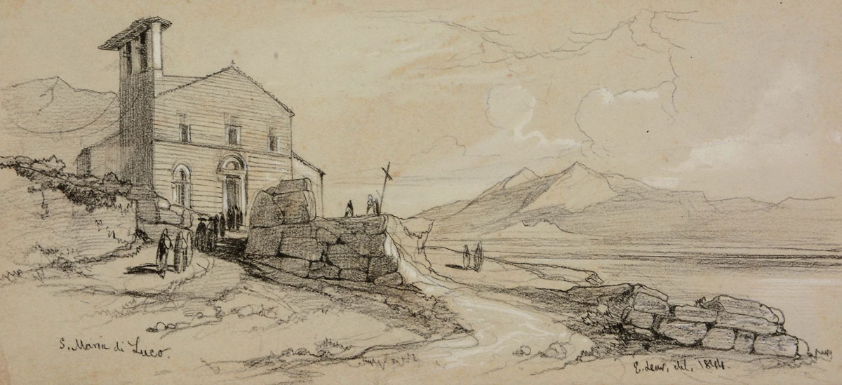 Black chalk, pencil, heightened with white, on light grey paper. Signed and dated 1844 lower right, inscribed S. Maria di Luco lower left. 9.5 x 20 cm. (3 3/4 x 7 7/8 in).