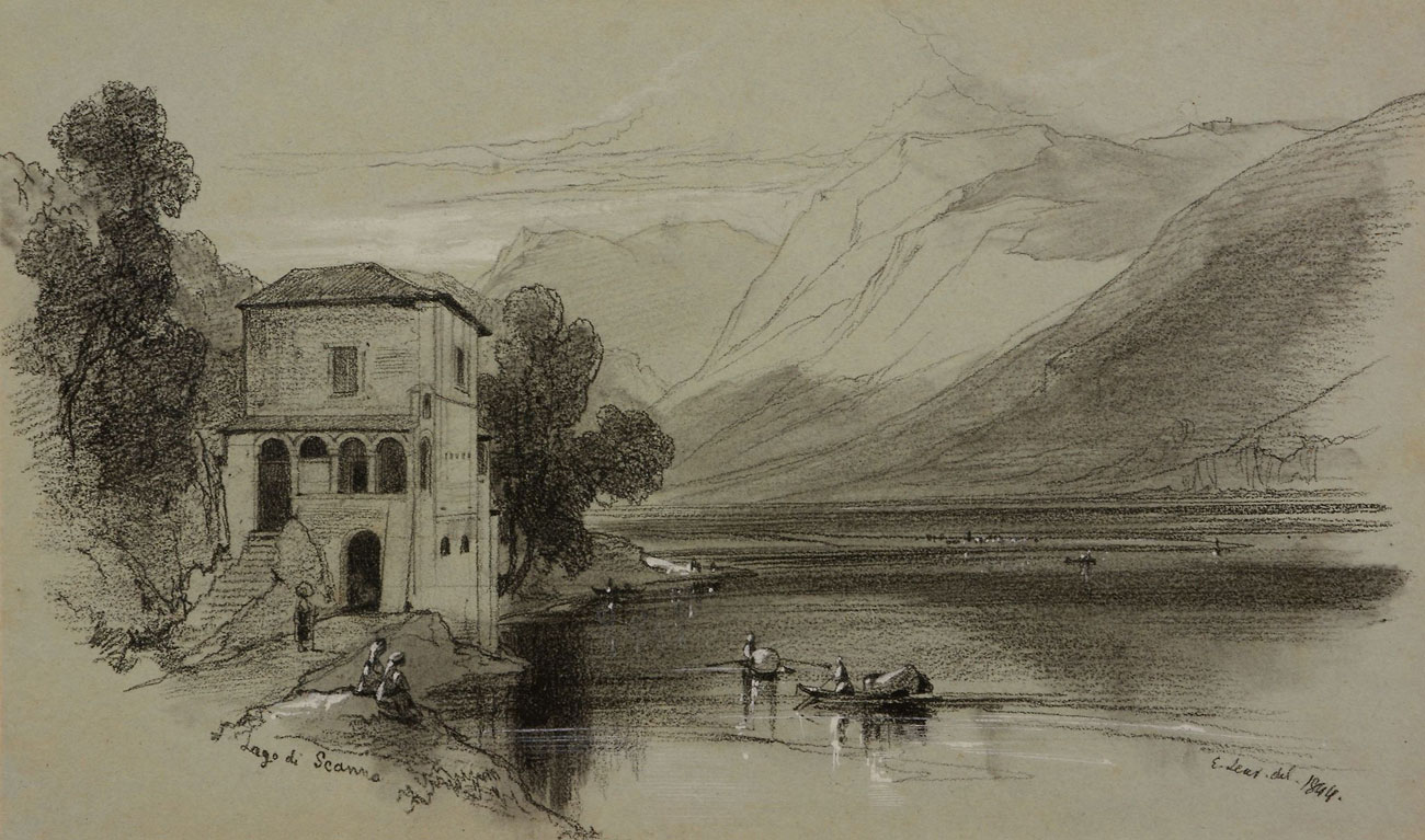 Black chalk, grey wash, heightened with white, on light blue grey paper. Signed and dated 1844 lower right, inscribed Lago di Scanno lower left. 15 x 24 cm. (6 x 9 1/2 in).