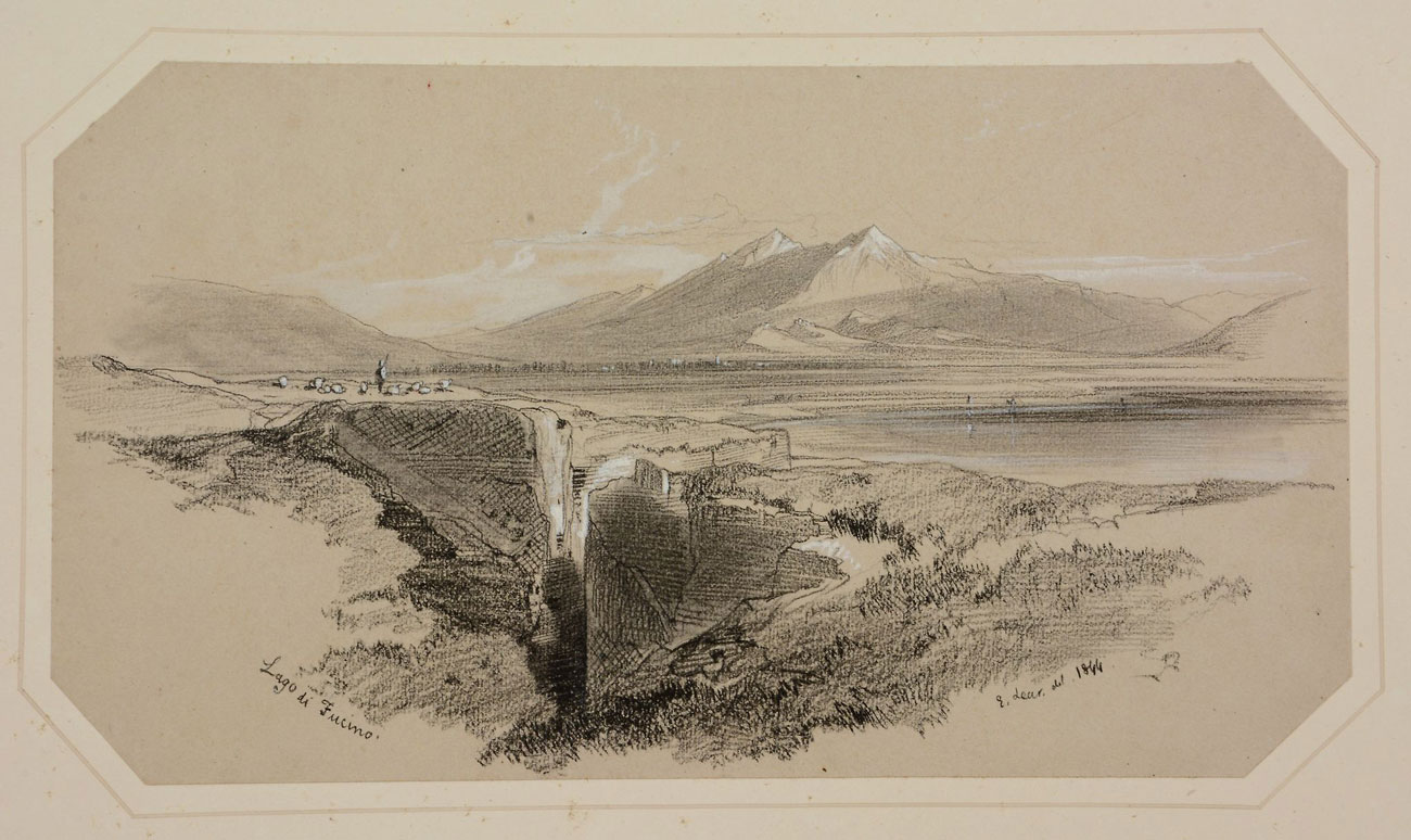 Black chalk, pencil, touches of wash, heightened with white, on light grey coloured laid paper. Signed and dated 1844 lower right, inscribed Lago di Fucino lower left. 14 x 26 cm. (5 1/2 x 10 1/4 in), corners trimmed.