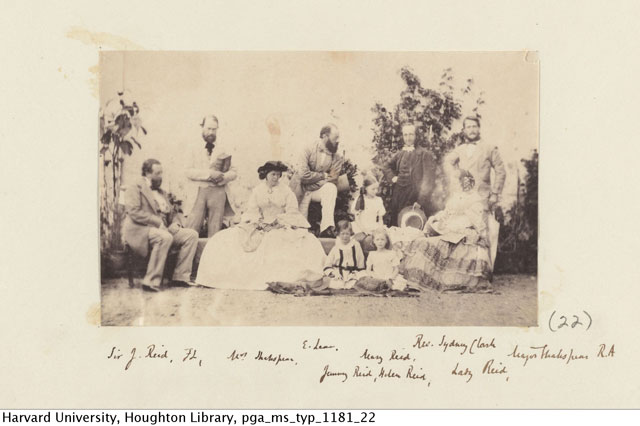 Houghton Library owns an album of photographs from Franklin Lushington’s family, and its website includes a finding aid linking to a couple of digitized photographs. The one above is of particular interest as it shows some of the people Edward Lear met almost daily while staying in Corfu in 1857-58.