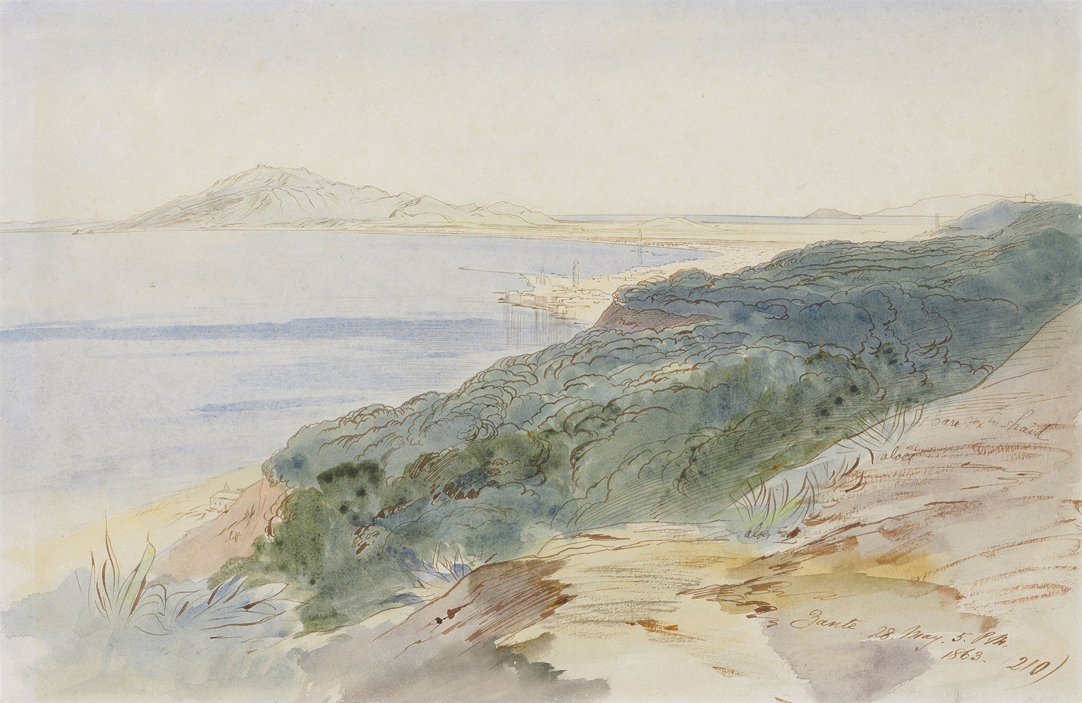 Inscribed, dated and numbered ‘Zante. 28. May. 5. P.M./ 1863/ (210)’ (lower right). Pencil, pen and brown ink and watercolour. 13 x 20 in. (33 x 50.8 cm.).