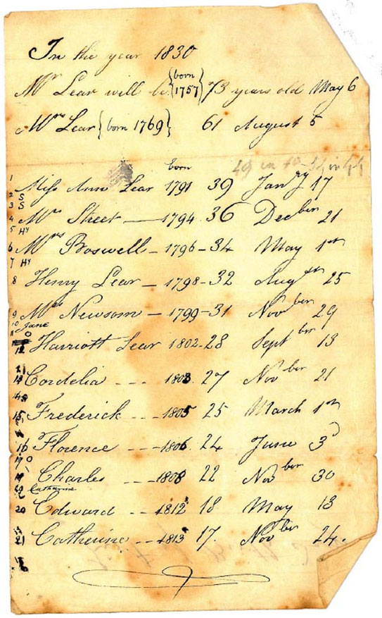 “Twentieth of twenty-one children” must be the most-often-repeated phrase in discussions of Edward Lear’s early life: no biographical sketch omits the snippet; but, did Jeremiah and Ann Lear really have so many children? Families of such size were not uncommon at the time, and Lear himself was responsible for spreading this idea; in a letter to Chichester Fortescue of 18 July 1859 announcing the death of his sister Harriett he wrote: