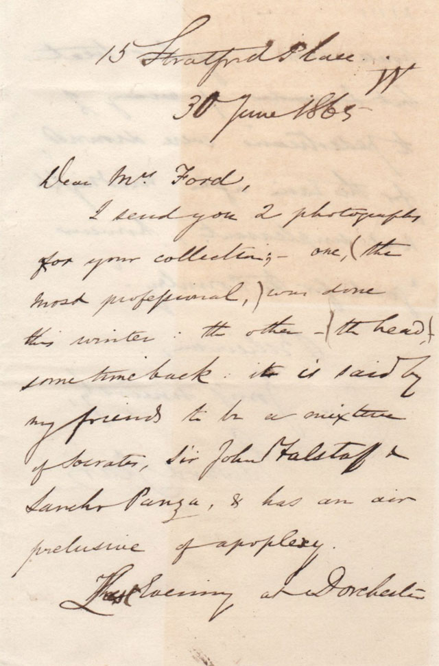 I send you 2 photographs for your collection; — one, (the most professional,) was done this winter: the other — (the head,) — some time back: it is said by my friends to be a mixture of Socrates, Sir John Falstaff & Sancho Panza, & has an air preclusive of apoplexy.