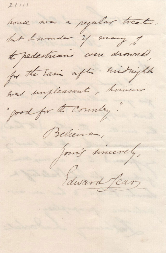 LEAR EDWARD: (1812-1888) English Artist, Illustrator and writer, remembered for his nonsensical poetry and limericks. A.L.S., Edward Lear, two pages, 8vo, Stratford Place, 30th June 1865, to Mrs. Ford. Lear sends his correspondent two photographs (no longer present), evidently of himself, for her collection, remarking ‘it is said by my friends to be a mixture of Socrates, Sir John Falstaff & Sancho Panza, & has an air preclusive of apoplexy.’ He further remarks on the previous evening at Dorchester House being ‘a regular treat’ although comments ‘I wonder if many pedestrians were drowned, for the rain after midnight was unpleasant, however “good for the country”‘. A small area of discolouration only lightly affects part of the text of the first page, otherwise VG