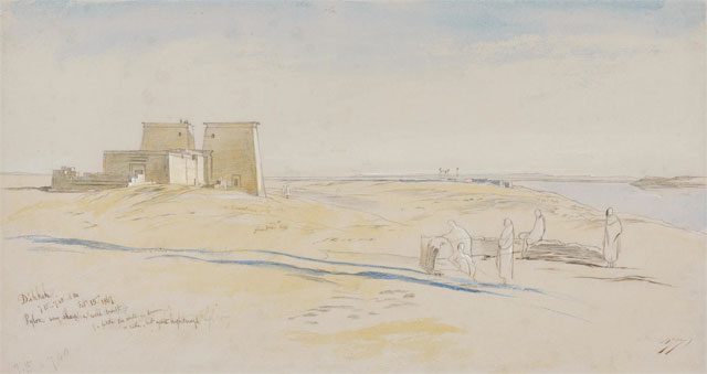 Inscribed and dated ‘Dakkeh./7.15 – 7.40 AM./Feb. 15. 1867./Pylon very sharp & well built/(a little too wide in drawing,)/or rather, not quite high enough’ (lower left); numbered ‘(477)’ (lower right); variously annotated throughout. Watercolour and ink heightened with white over traces of pencil. 28.9 x 54.4cm (11 3/8 x 21 7/16in).