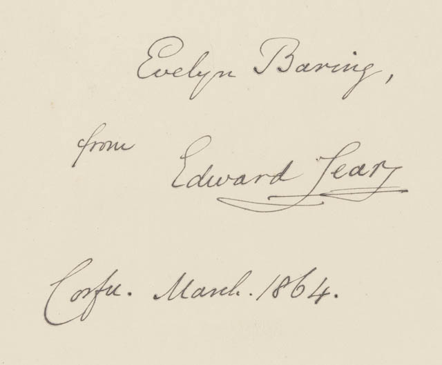 Greece.- Lear (Edward) Views in the Seven Ionian Islands, signed presentation copy from Lear to Evelyn Baring inscribed “Corfu March 1864” fly-leaf, tinted lithographed title and 20 tinted lithographed plates, plate guards, each plate with accompanying leaf of text, list of subscribers, some scattered foxing mostly in margins, bound in handsome contemporary green morocco, gilt, g.e.,by Bickers & Son London, housed in a modern slip-case, [Blackmer 987], folio, 1863.