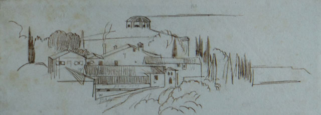 EDWARD LEAR pen & ink – small sketch of Italian village, possibly preliminary sketch for a larger work, pencil notations, 5.5 x 13cms
